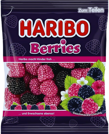 Haribo Berries to klasyczne, chrupiąco-miękkie żelki o smaków owoców leśnych - malin i jeżyn. Każda sztuka pokryta jest charakterystycznymi, chrupiącymi kuleczkami, które nadają im wyjątkową teksturę i intensywny owocowy aromat. To jeden z najbardziej kultowych produktów Haribo, uwielbiany przez dzieci i dorosłych.